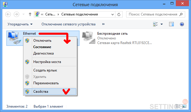 Шаг 6. Нажмите по значку "Ethernet" правой кнопкой мыши и в меню выберите пункт "Свойства".